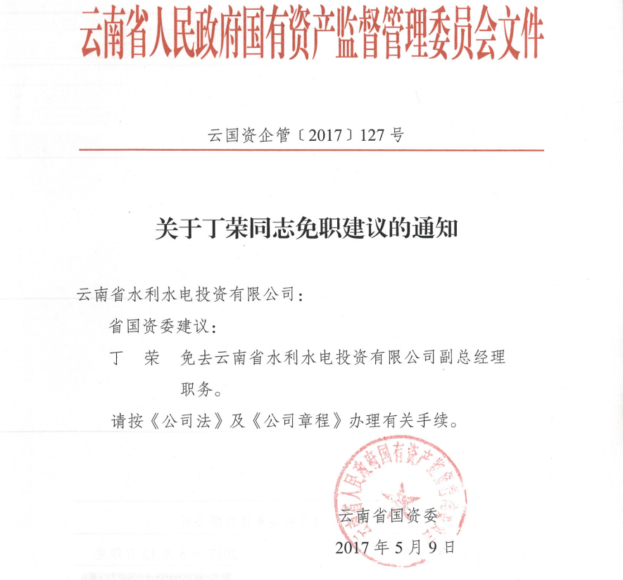 云南省國(guó)資委關(guān)于丁榮同志免職建議的通知